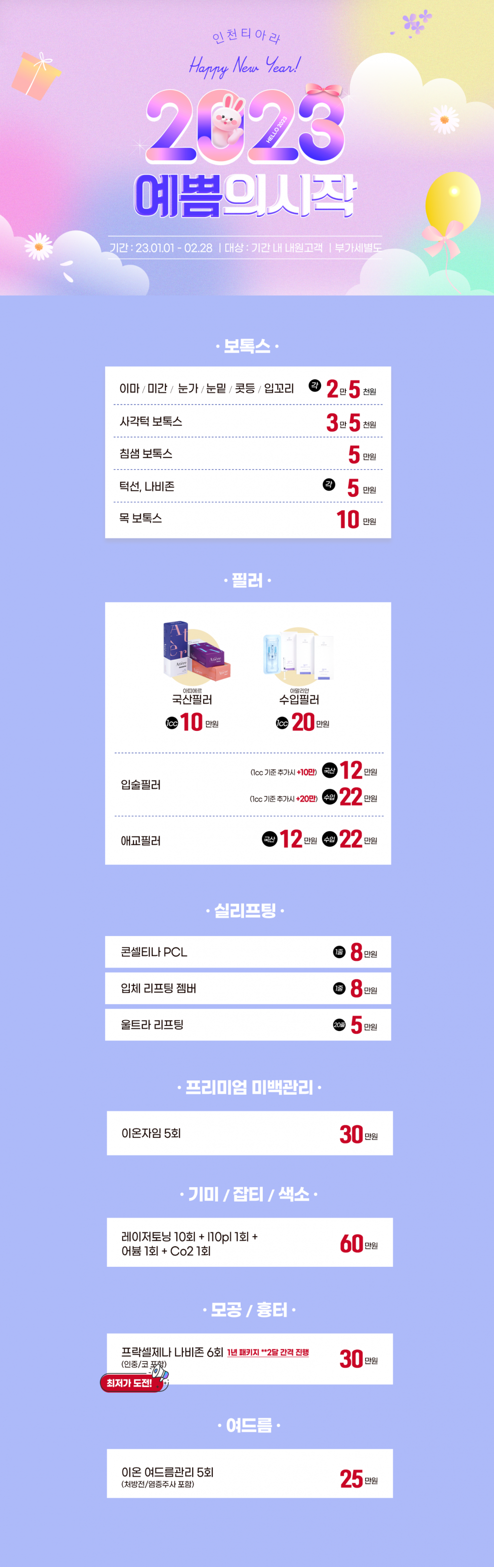 인천티아라 1월&2월 이벤트 페이지 정보 작성자 관리자 작성일23-01-03 11:36 조회3,046회 댓글0건 관련링크 이전글 다음글 목록 본문 인천티아라 새해 이벤트 안내드립니다. 많은 관심 부탁드립니다 :) 댓글목록 등록된 댓글이 없습니다. 이전글 다음글 목록