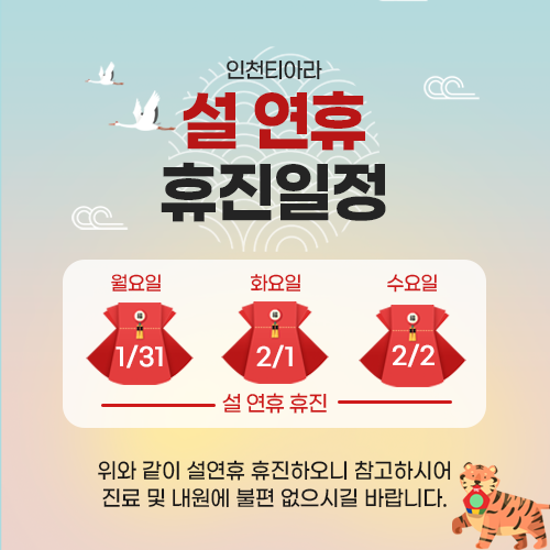 인천티아라 설 연휴 휴진 안내 페이지 정보 작성자 관리자 작성일22-01-27 11:59 조회3,043회 댓글0건 관련링크 이전글 다음글 목록 본문 인천티아라 설 연휴 휴진 안내드립니다. 댓글목록 등록된 댓글이 없습니다. 이전글 다음글 목록