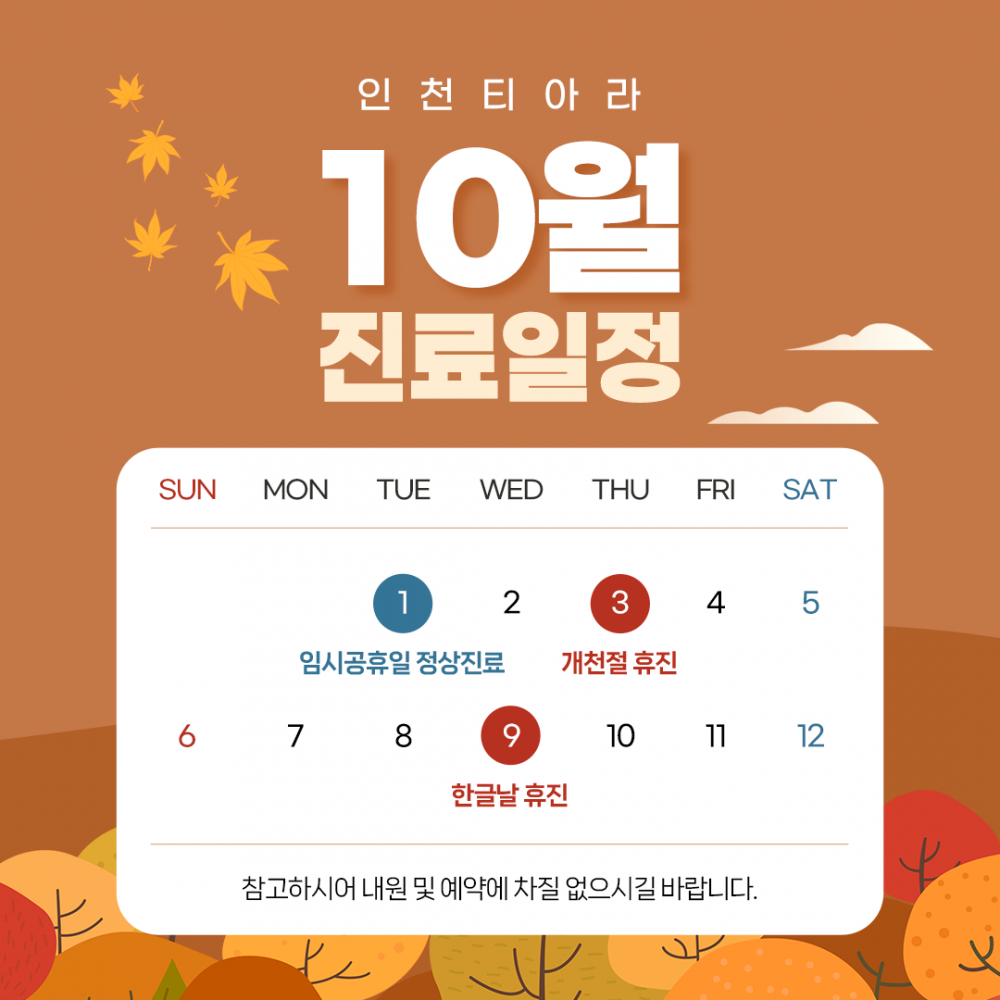 10월 3일, 9일 공휴일 휴진이므로 내원에 하질 없으시길 바랍니다